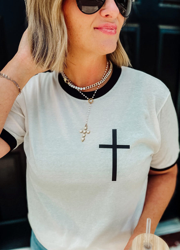 This inspirational white t-shirt features elegant black script reading “Daughter of the King” with a cross accent, celebrating faith and strength with a casual, stylish design perfect for everyday wear.