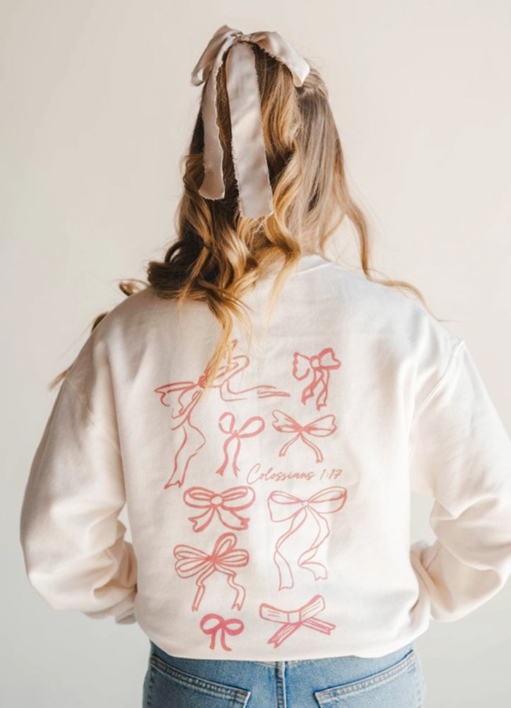 Delicate details, powerful truth — this ivory long sleeve features an elegant bow illustration design paired with Colossians 1:17: 'He holds all things together.' A cozy reminder of grace and strength in every thread.