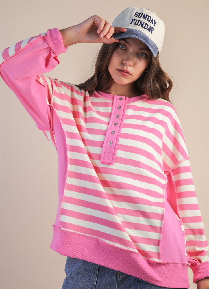 Oversized Striped Half Button LS Top in Pink/Cream by Very J