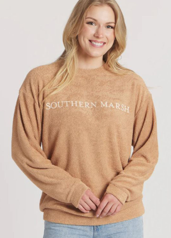Wrap yourself in effortless comfort with the Southern Marsh crewneck sweatshirt. Designed in a warm camel hue, this cozy pullover is crafted from ultra-soft fabric that feels as good as it looks. Featuring a relaxed fit with long sleeves and ribbed detailing, it delivers the perfect balance of casual style and everyday ease. The bold “Southern Marsh” logo across the chest adds a signature touch, making it a standout staple for any wardrobe. Ideal for layering on chilly mornings or wearing solo for laid back days, this sweatshirt is the perfect blend of comfort, style, and Southern charm.