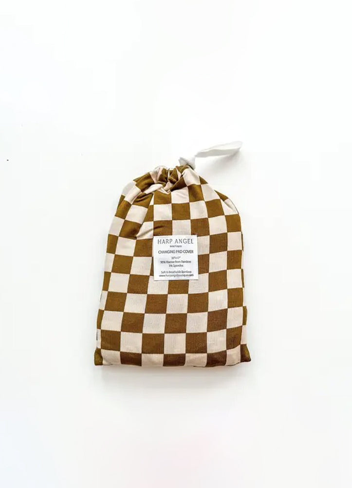 Keep your nursery stylish and functional with our Toffee Checkerboard Changing Pad Cover from Harp Angel!