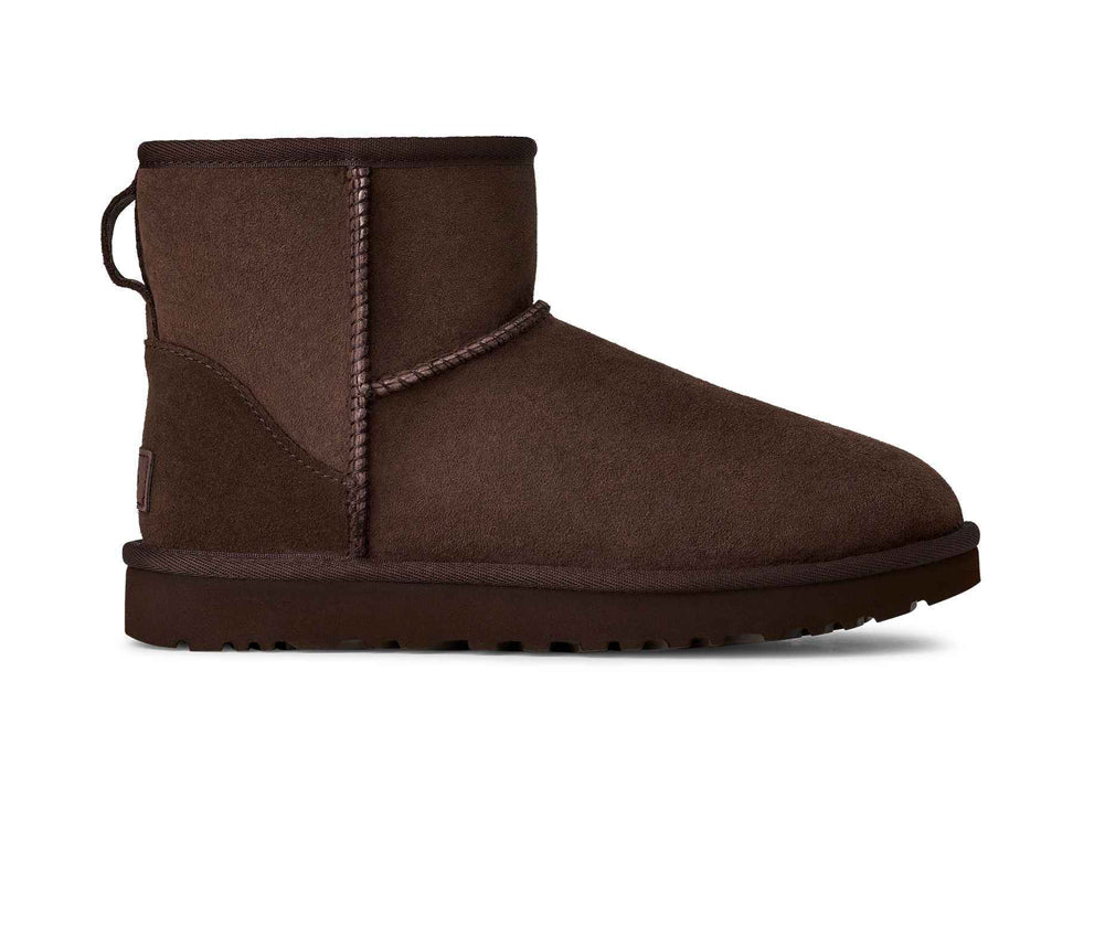 Cozy classic short boot in rich chestnut brown suede, featuring a soft lining and durable sole for warmth, comfort, and timeless everyday style.