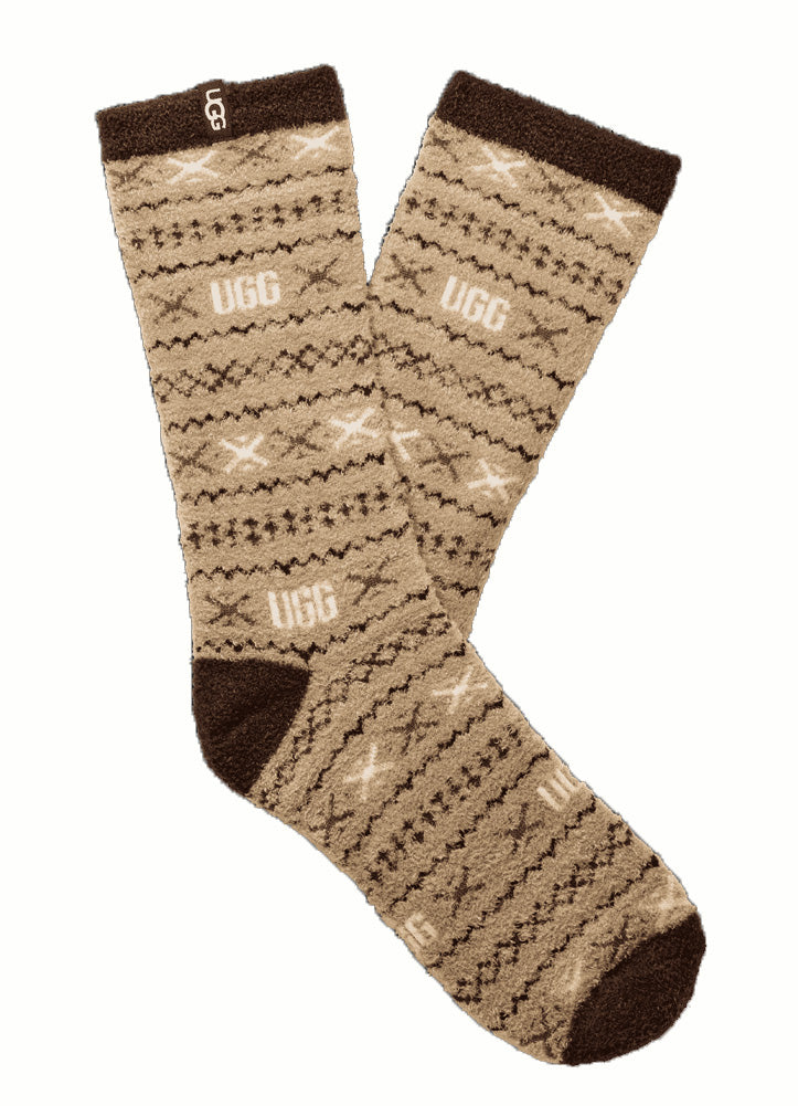Wrap your feet in ultra-soft warmth with these plush UGG crew socks. Featuring a cozy jacquard pattern in rich camel and chocolate tones, they're perfect for lounging, layering, or gifting.
