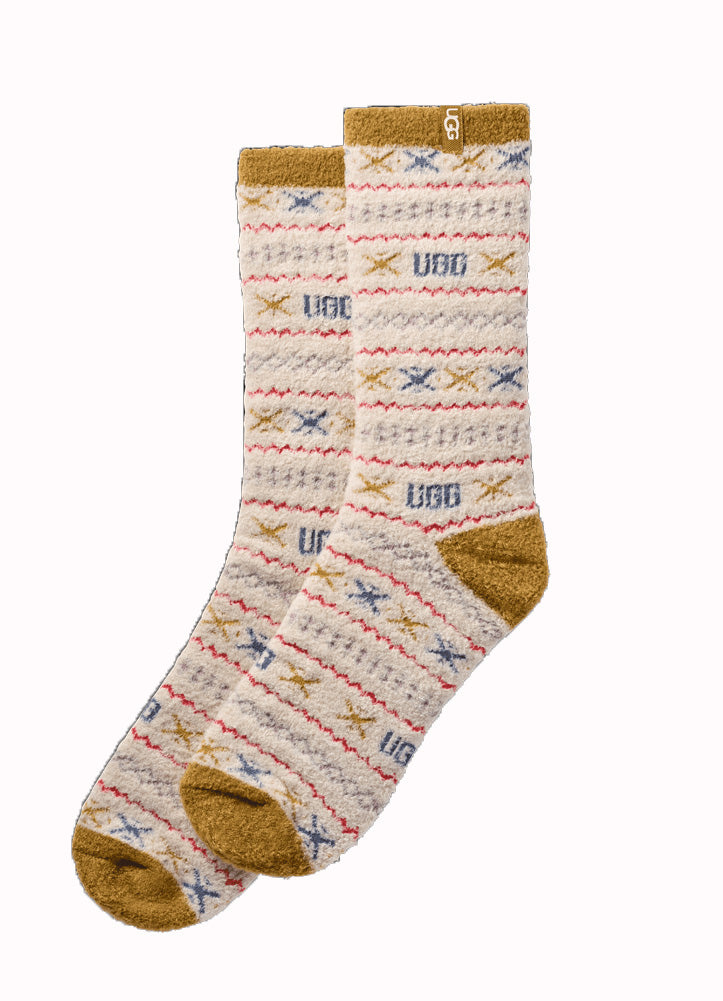 Infuse your cold-weather wardrobe with warmth and whimsy. These ultra-soft crew socks from UGG feature a festive jacquard pattern in oatmeal, gold, blue, and red — the perfect touch of cozy charm for lounging or layering.