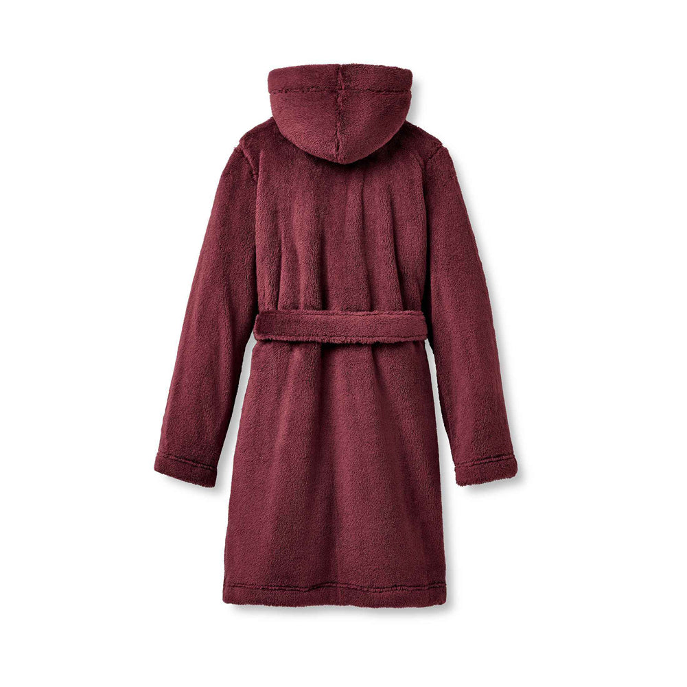 Luxuriously soft and warm, this wine-colored hooded robe features plush fleece fabric, a waist tie, and front pockets for cozy, all-day comfort.