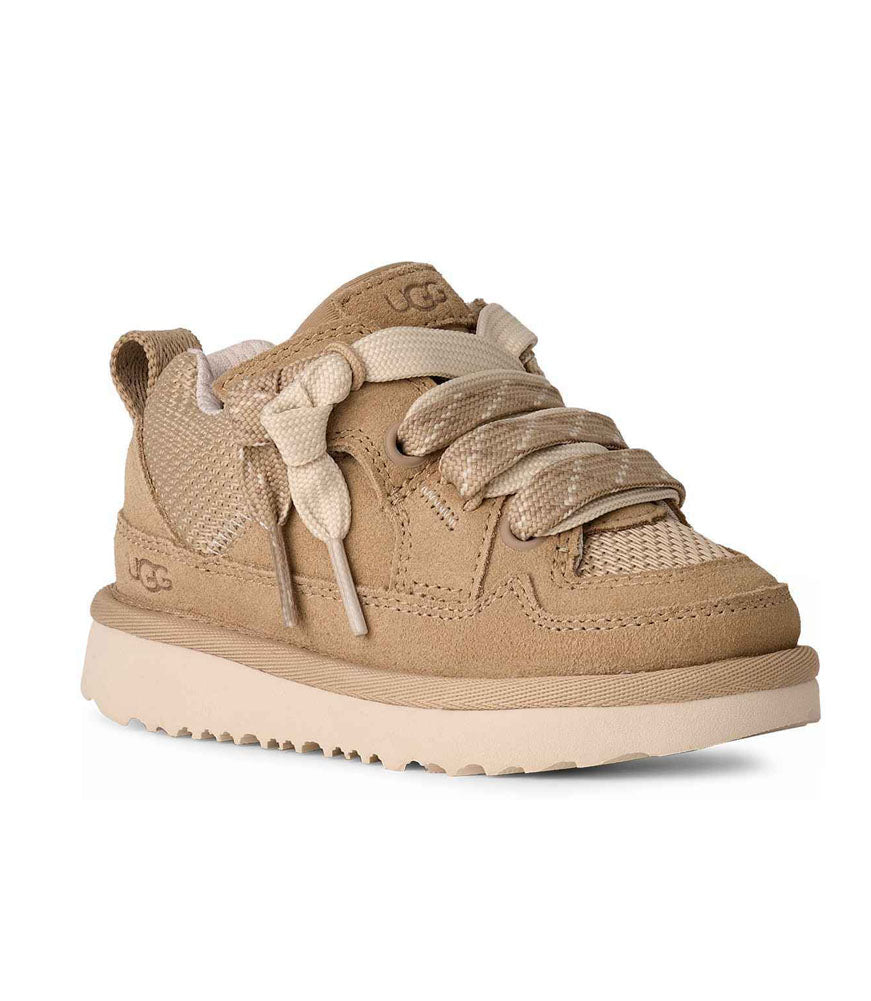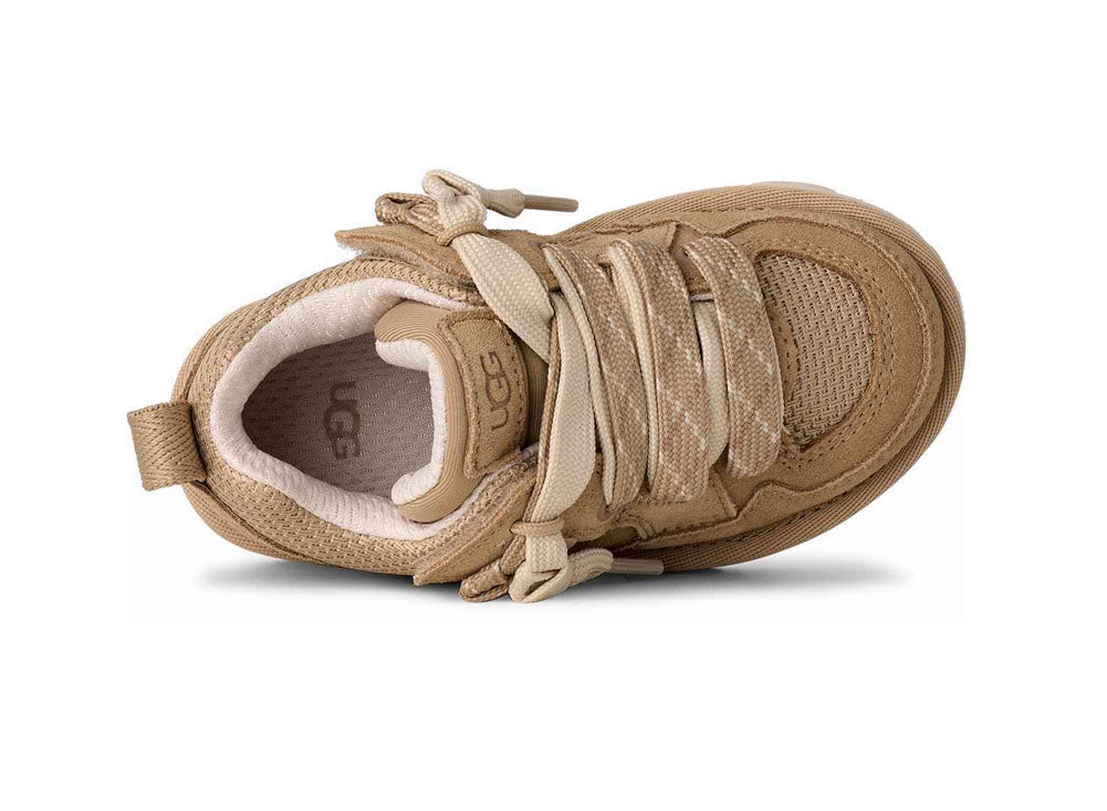 These tan toddler sneakers feature a mix of suede and mesh for durability, cushioned comfort, chunky laces, and a grippy sole for all-day wear for your toddler