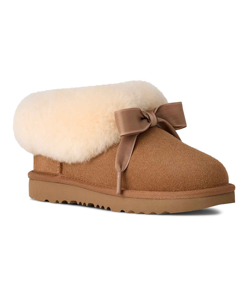 This cozy suede slipper features a plush, fluffy collar and a charming satin bow detail, blending warmth and sweetness into a stylish design that's perfect for effortless comfort at home or on the go.