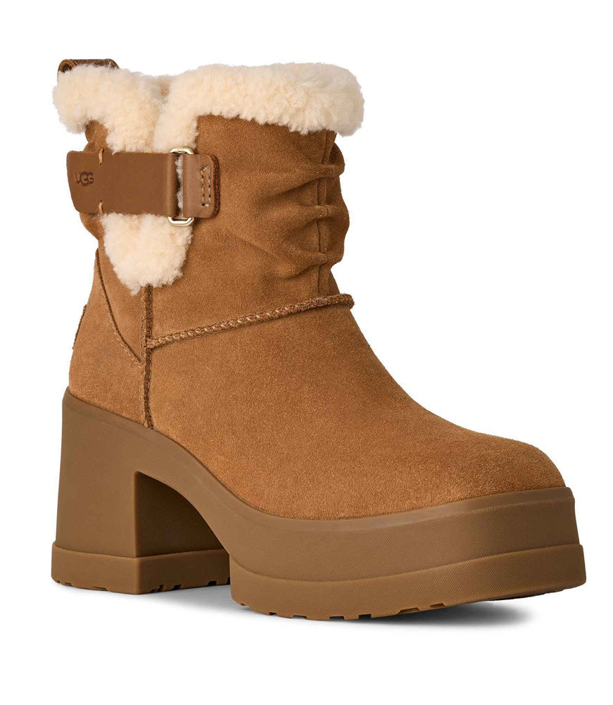 This chic suede boot features a cozy shearling collar, stylish buckle detail, and a bold block heel, blending cold-weather warmth with elevated everyday fashion for a confident, comfortable look.