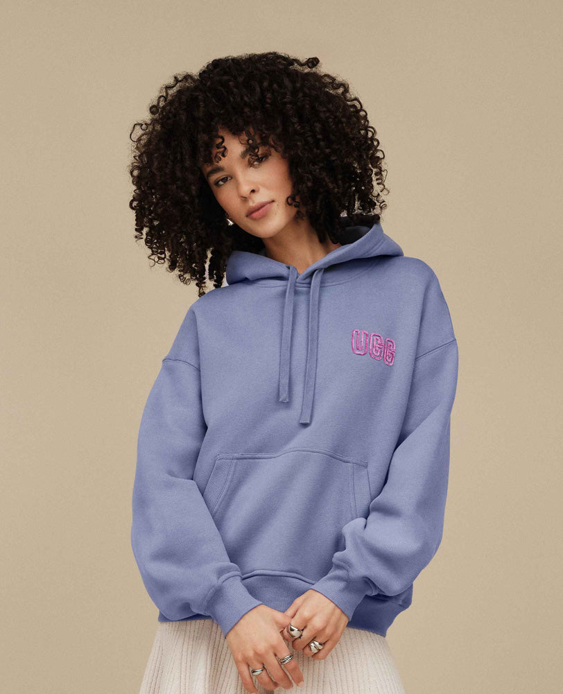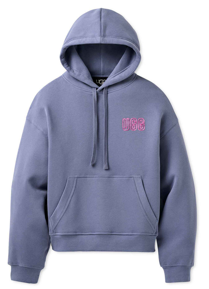 “This cozy blue UGG hoodie blends relaxed comfort with playful style, featuring soft fleece fabric, a roomy hood, a classic kangaroo pocket, and textured pink logo detailing for a laid-back yet eye-catching everyday look.