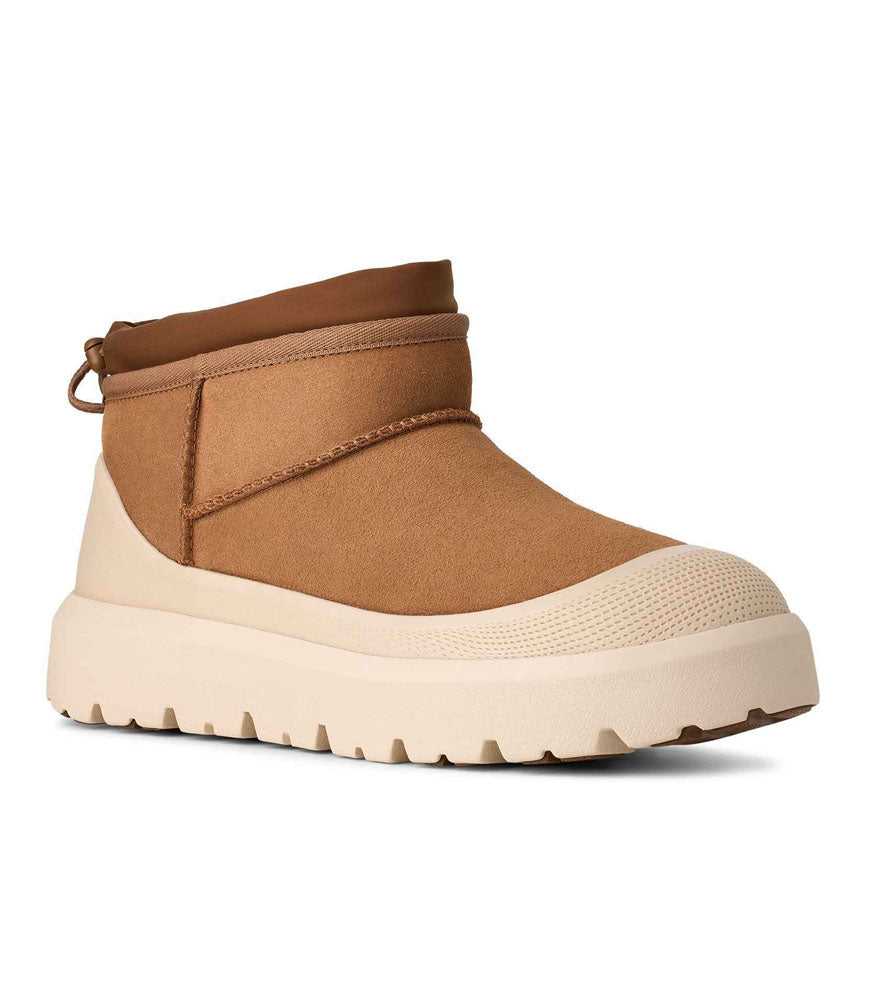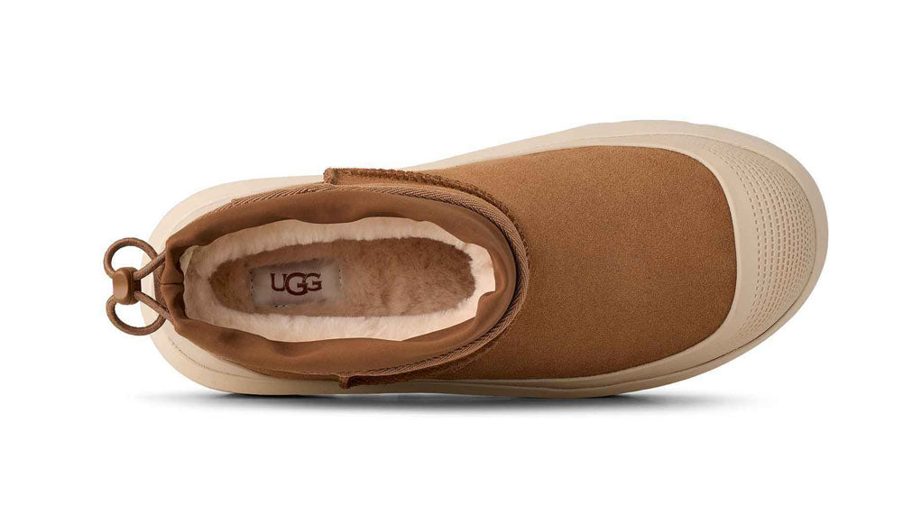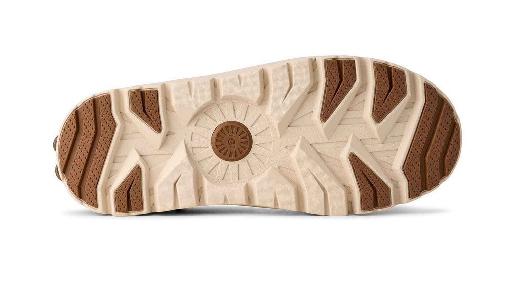 These UGG boots feature chestnut suede with a contrasting white sole, durable toe guard, and padded collar, blending rugged protection with modern comfort.