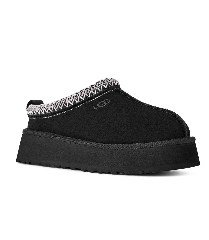 This black UGG slipper features a soft suede upper, cozy lining, bold platform sole, and stylish woven trim for comfort with a modern edge. Perfect for pairing with leggings or pants.
