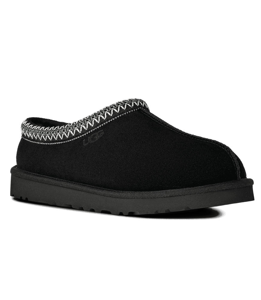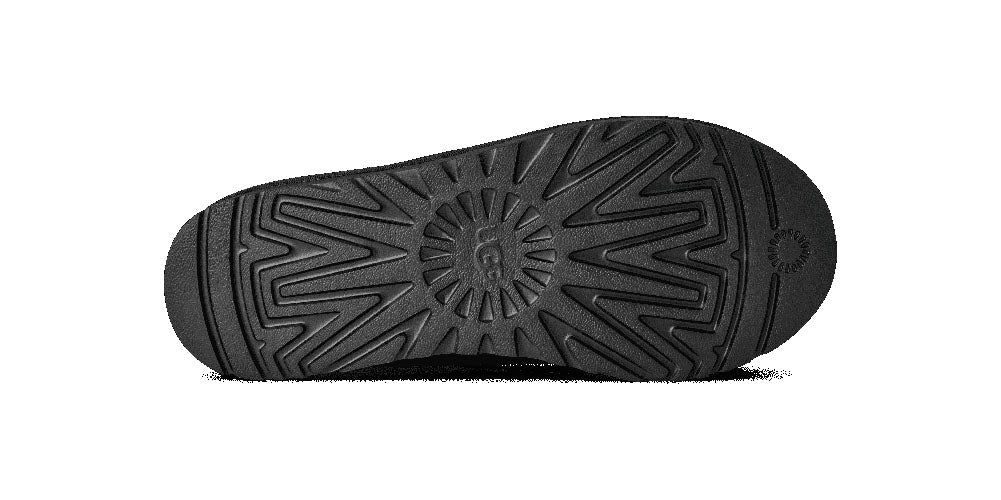 This black UGG slipper is crafted with a sleek suede upper, cozy plush lining, a bold platform sole, and detailed woven trim, delivering modern style with lasting comfort.