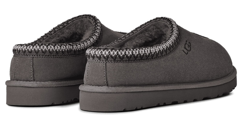 This dark grey UGG slipper features a premium suede upper, soft plush lining, durable sole, and stylish woven trim, delivering cozy warmth and timeless everyday comfort.