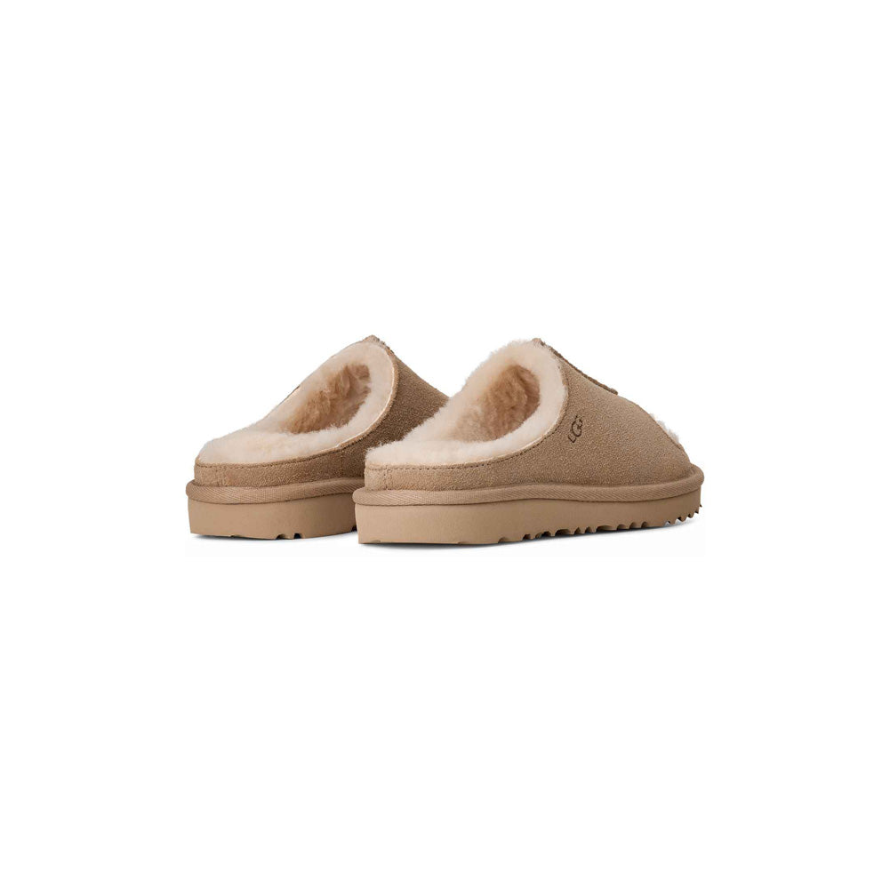 These Children's UGG slide slippers are designed for all-day comfort with the effortless style UGG is known for. Crafted with a soft suede upper, this easy slip-on silhouette features an open toe for breathable wear and a plush UGG plush lining that gently cushions little feet in warmth and softness. The lightweight platform-style sole offers added comfort and support, making them perfect for lounging at home or quick trips outside. A durable outsole provides reliable traction, while the simple, cozy design makes these slides easy to pair with pajamas, loungewear, or casual outfits. Finished with subtle UGG branding and a snug, supportive fit, these slippers deliver the perfect balance of comfort and practicality. Ideal for kids who love the feel of a slipper with the versatility of a shoe, this pair is a go-to favorite for everyday wear.