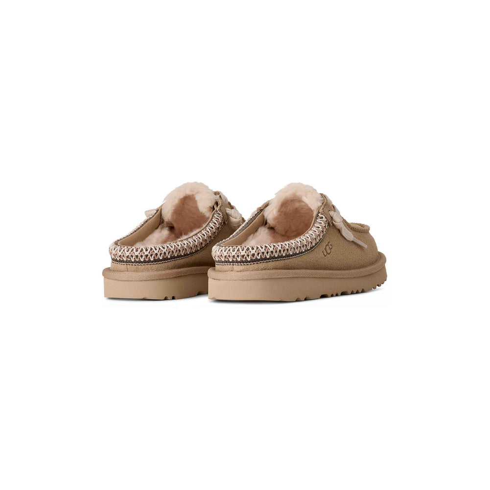 These Children's UGG Tasman Mules deliver iconic comfort in a kid-friendly, easy-to-wear design. Crafted with a soft suede upper, this slip-on style features UGG's signature braid detailing along the collar for a classic look kids love. The cozy UGG plush lining keeps little feet warm and comfortable, making these mules perfect for lounging at home, carpool mornings, or quick outdoor adventures. A lightweight yet durable outsole provides traction and support, so kids can move confidently from indoors to outdoors without changing shoes. Finished with subtle UGG branding and a cushioned footbed, the Children's Tasman Mule offers the perfect blend of comfort, style, and practicality. Easy to slip on, ultra-soft inside, and built for everyday wear, this timeless favorite is a go-to choice for parents and kids alike.