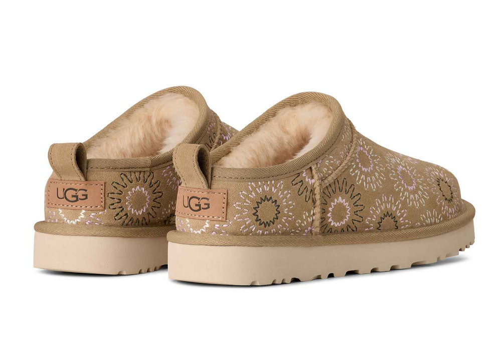 Playful yet cozy, this UGG slip-on clog features a soft suede upper with charming floral embroidery that adds a fun, feminine touch. Designed with a cushioned sole and easy pull-on fit, it offers all-day comfort while bringing a standout style to casual outfits, cozy days at home, or relaxed everyday wear.