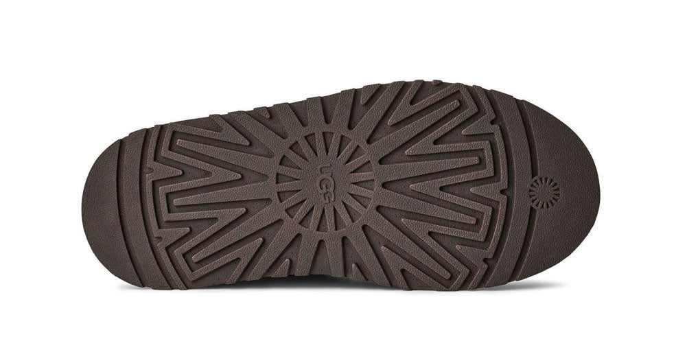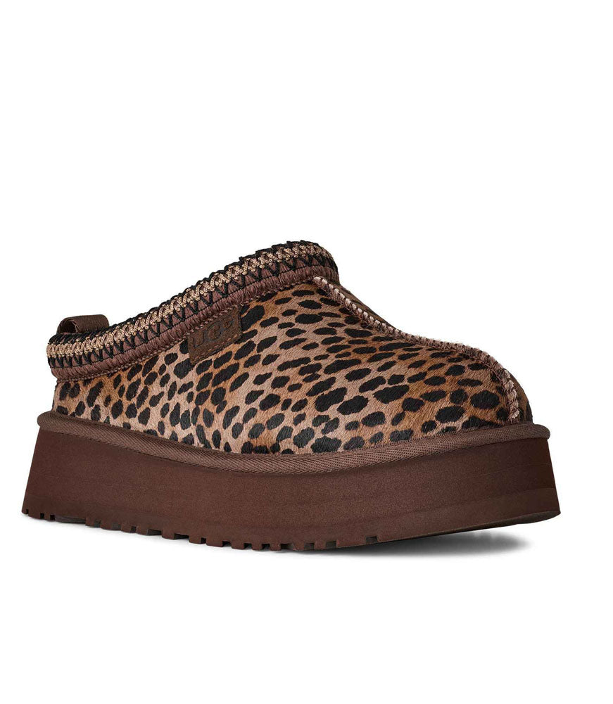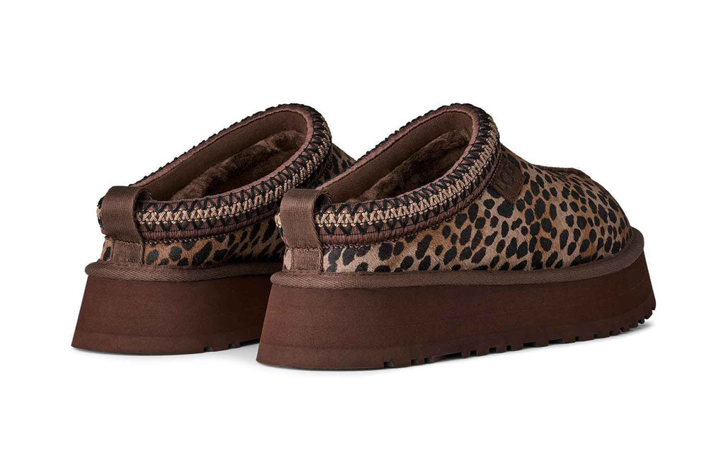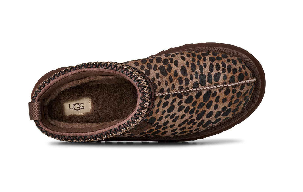 This leopard-print UGG slipper features a bold suede upper, plush wool lining, elevated platform sole, and detailed woven trim, blending cozy comfort with a standout modern style.