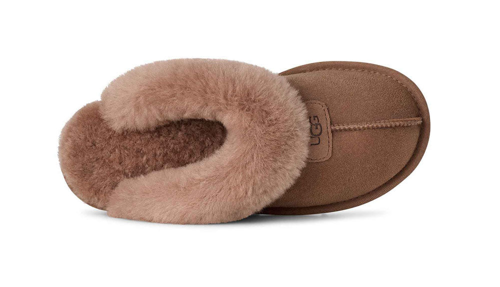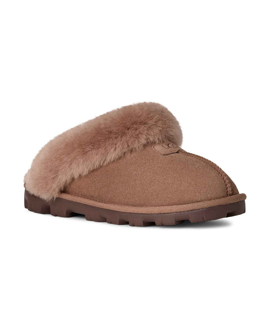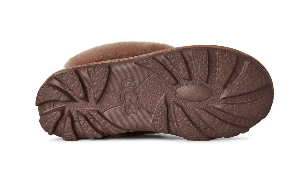 This chestnut UGG slipper features a soft suede upper, plush sheepskin collar, cozy lining, and durable sole, offering luxurious warmth, comfort, and timeless style.
