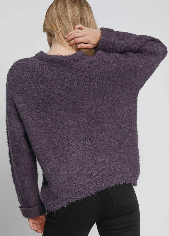 Cozy meets chic with this plush plum sweater, the perfect addition to your cold weather wardrobe. Designed with a relaxed fit, it features a soft, textured knit that feels as good as it looks. The drop shoulder silhouette and slightly oversized sleeves add a casual, laid back vibe, while the rich plum color brings a touch of elegance to your everyday style. Ideal for pairing with jeans, leggings, or skirts, this versatile sweater keeps you warm without sacrificing comfort. Whether lounging at home or heading out for a casual outing, it's a must have staple for effortless, cozy style all season long.