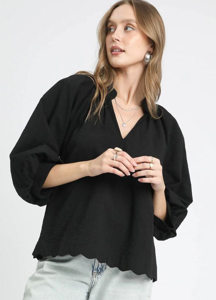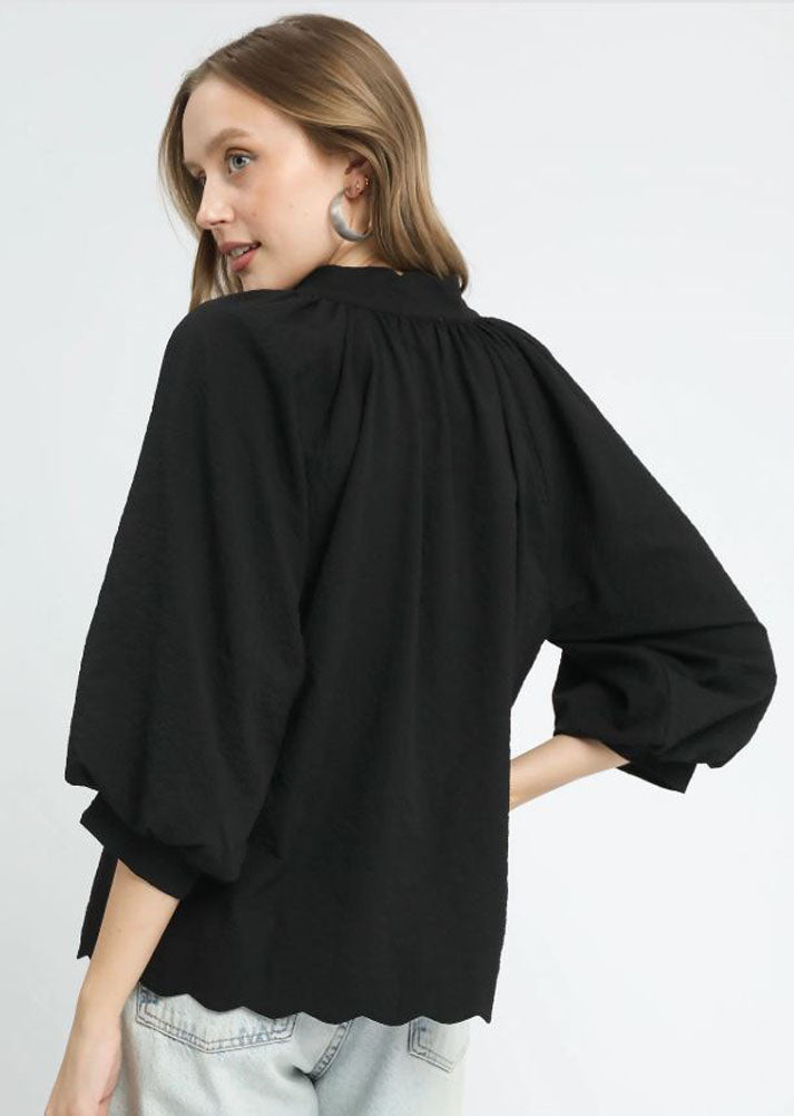 Effortless and chic, this black blouse is a versatile staple for any wardrobe. Designed with a flattering V-neckline and flowy silhouette, it offers both comfort and elegance. The statement balloon sleeves add a modern, feminine touch, while the scalloped hemline creates subtle detail for a polished finish. Crafted from lightweight fabric, it drapes beautifully and pairs effortlessly with jeans, skirts, or tailored pants. Perfect for both casual outings and dressier occasions, this blouse brings timeless style with a contemporary twist, making it an essential piece you'll reach for again and again.