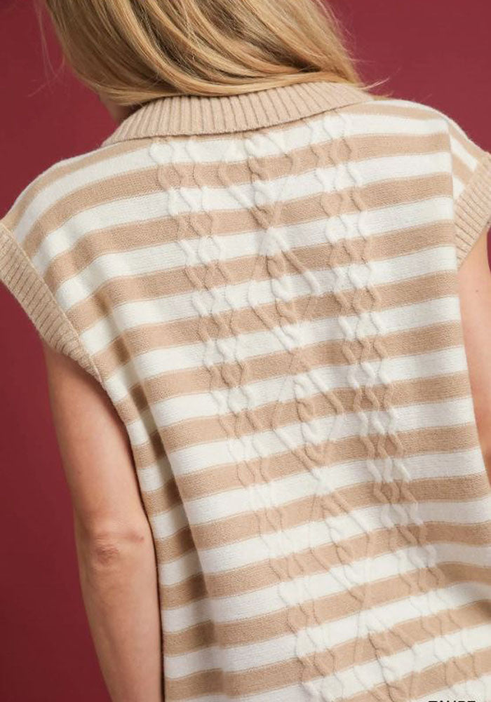 Chic and versatile, this striped knit sweater vest is the perfect layering piece for year round style. Featuring a neutral tan and white stripe pattern, it's designed with a relaxed fit and a split V-neckline for a modern, effortless look. Subtle cable knit detailing adds texture and charm, while ribbed trim at the hem provides a polished finish. Wear it solo with jeans or trousers for a casual vibe, or layer it over a crisp button-down or turtleneck for a sophisticated twist. Comfortable and stylish, this sweater vest brings timeless appeal with a contemporary edge to any wardrobe.