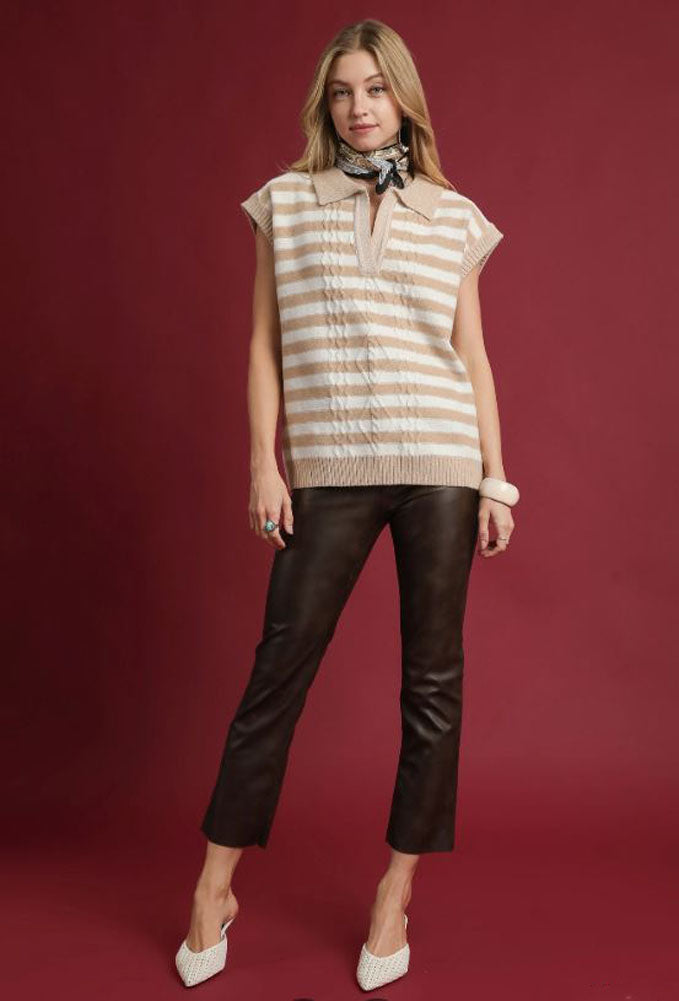 Cable Knit Collared Vest Sweater in Taupe by Umgee