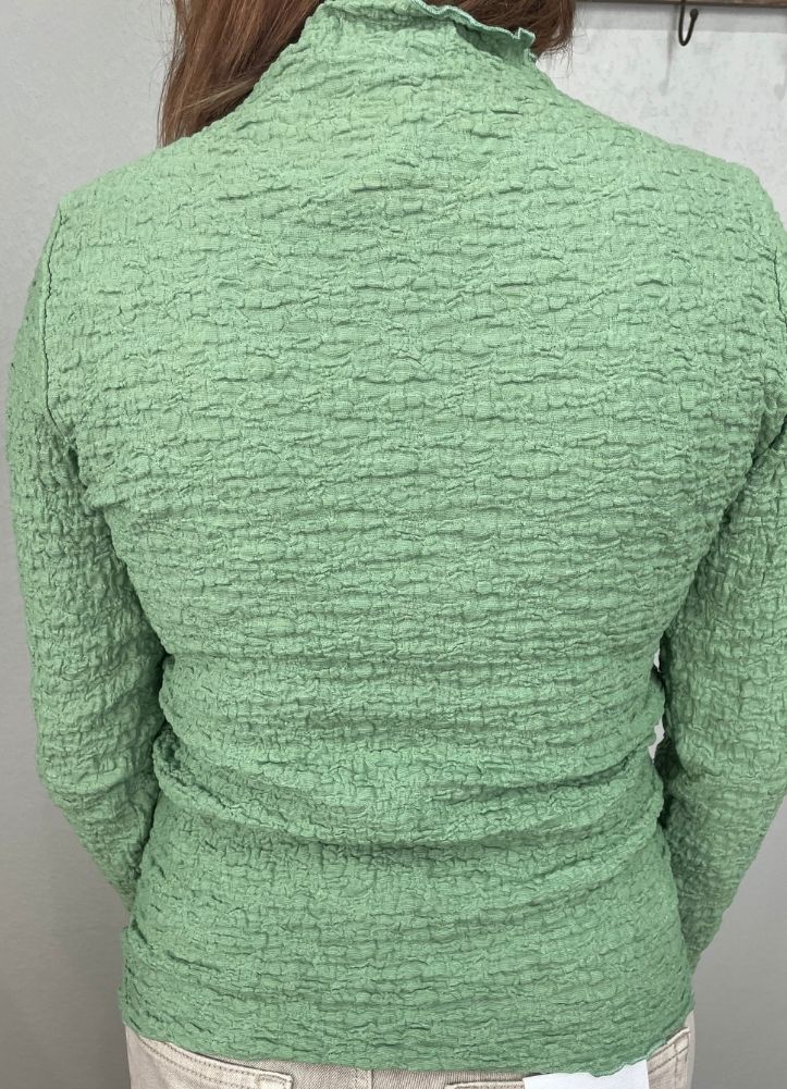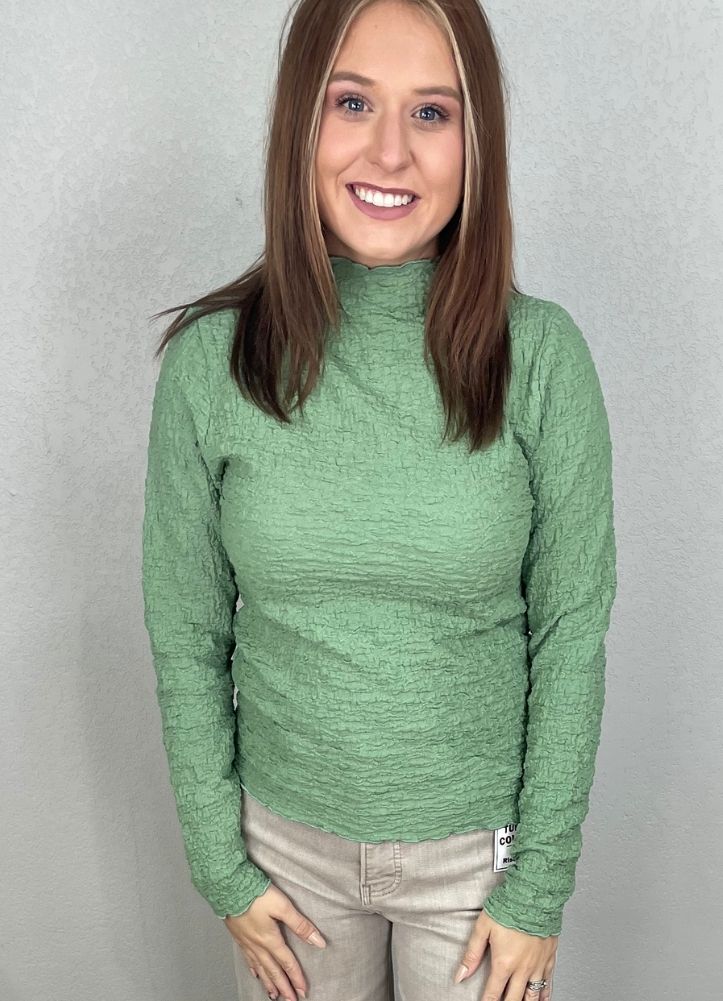 Freshen up your basics with this textured sage green long sleeve top, featuring a flattering mock neck and a fitted silhouette. The crinkled fabric adds dimension and style, making it perfect for layering under jackets or pairing with high-rise jeans. Comfortable yet chic, this versatile top is a must-have staple that transitions effortlessly from casual days to polished looks.