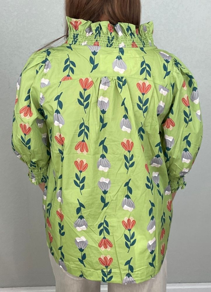 Brighten your wardrobe with this lively green blouse, featuring a playful tulip floral print in shades of red, white, and gray. Designed with puff sleeves, smocked details, and a flattering v-neckline, it blends feminine charm with modern style. Perfect for spring and summer outings, this blouse pairs beautifully with denim or neutral trousers for a fresh, cheerful look.