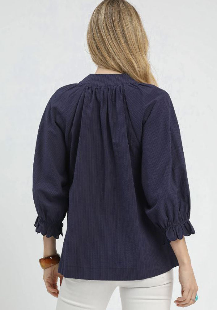 Textured Stripe Scallop Trim Blouse in Navy by Umgee