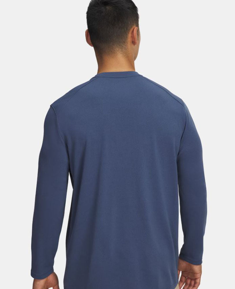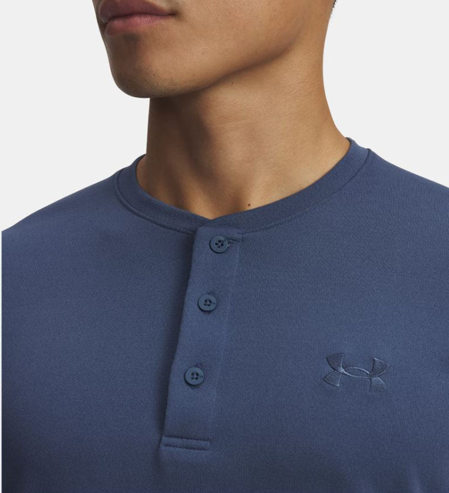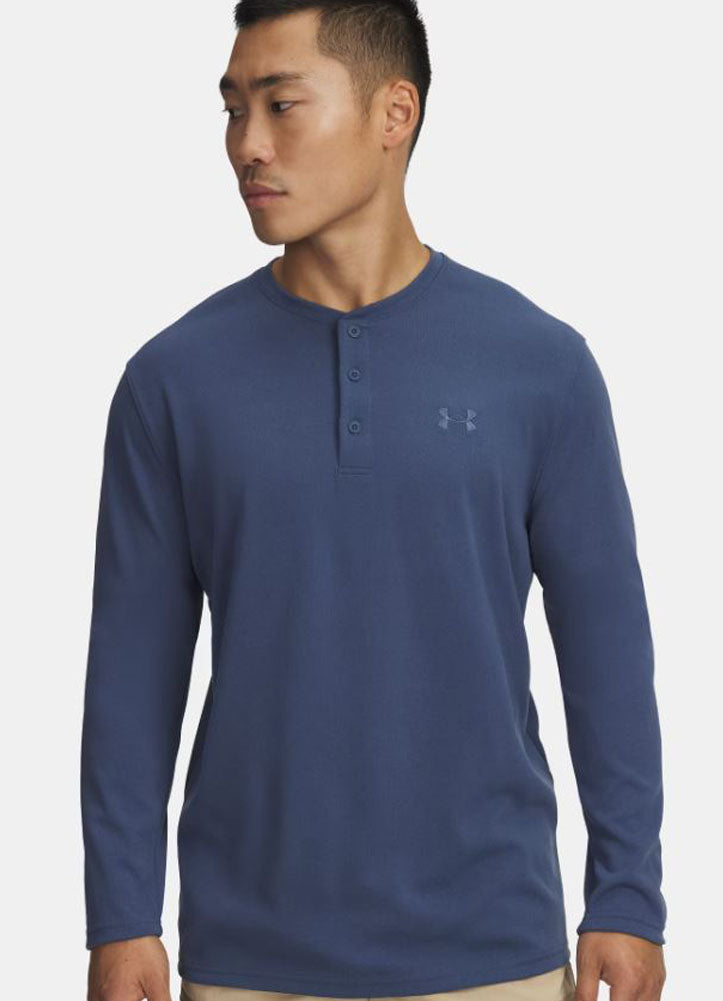 This navy blue Under Armour long-sleeve henley shirt features a classic three-button placket, lightweight breathable fabric, and a relaxed fit for versatile comfort and style.