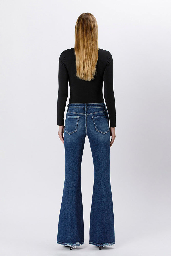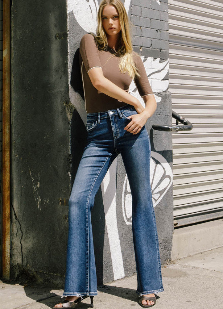 A quality flare jean is a classic wardrobe staple. This high rise pair from Loveret is a medium wash classic five pocket style. Pair with your favorite boots or heels for a great look.