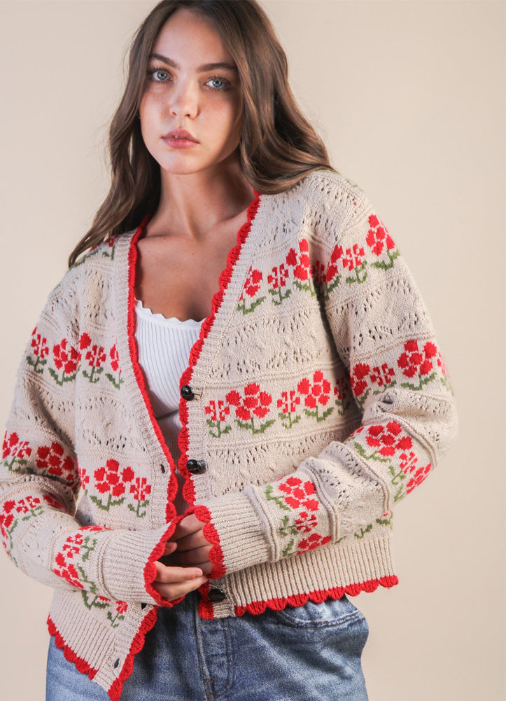Add a charming, vintage-inspired touch to your wardrobe with this beautifully knit floral cardigan. Featuring an intricate allover pattern of delicate red blooms set against a soft neutral background, this piece brings warmth, personality, and timeless appeal to any outfit. The classic button-front design is accented with contrasting trim along the neckline, cuffs, and hem, adding a playful pop of color and a polished finish. Crafted from a cozy knit fabric, it offers comfortable warmth while remaining lightweight enough for easy layering. Wear it buttoned up as a statement top or open over a simple tank or tee for a relaxed, effortless look. Perfectly paired with denim, skirts, or trousers, this cardigan transitions seamlessly from casual daytime styling to cozy evenings. Whether you're drawn to its nostalgic charm or its standout details, this piece is a versatile layering essential you'll reach for season after season to elevate your everyday outfits.