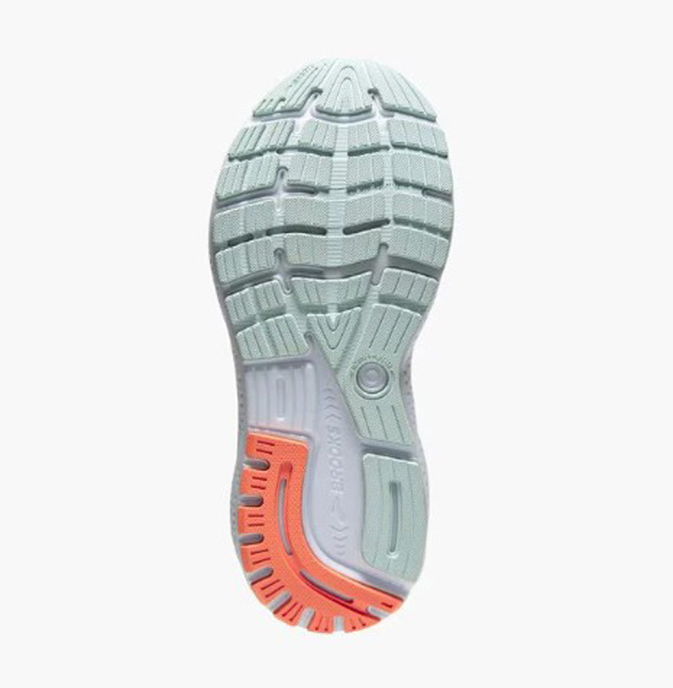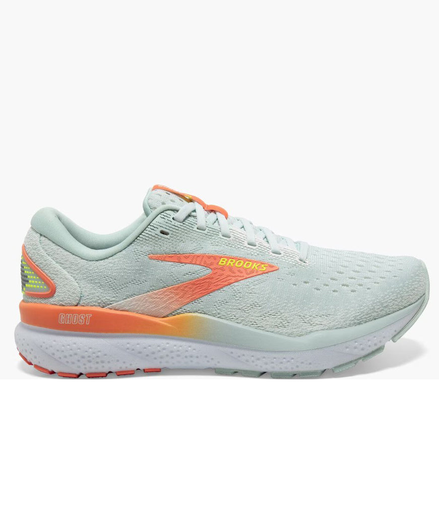 Brooks Ghost Running Shoe – Featuring a lightweight mint mesh upper with vibrant coral and yellow gradient accents, this cushioned trainer blends comfort and style for everyday runs.
