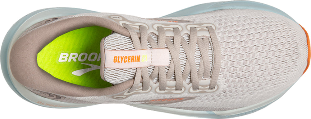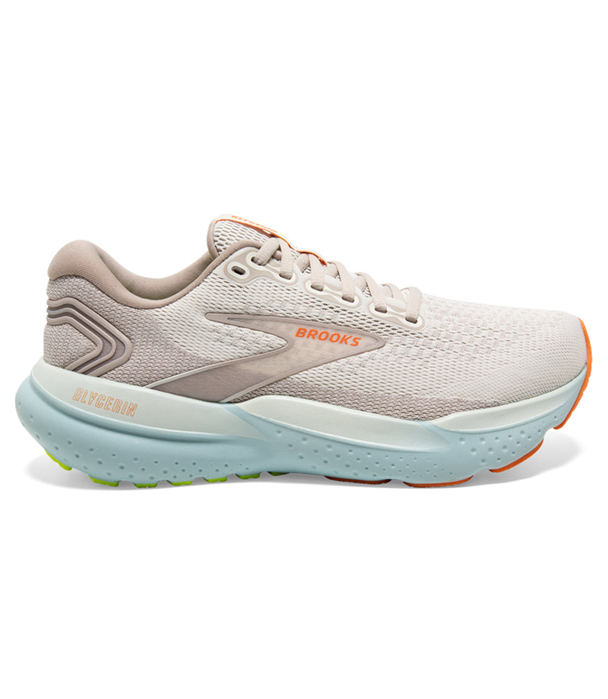 Brooks Glycerin Running Shoe – A plush neutral trainer in soft beige tones with sleek taupe detailing, set atop a sky-blue cushioned sole and finished with bold orange accents for a refined yet dynamic look.