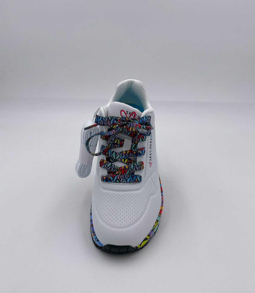 Add a pop of personality to your step with these white Skechers featuring a vibrant, heart-inspired multicolor sole and matching laces. Designed for comfort and standout style, they're perfect for making everyday outfits fun, bold, and uniquely you.