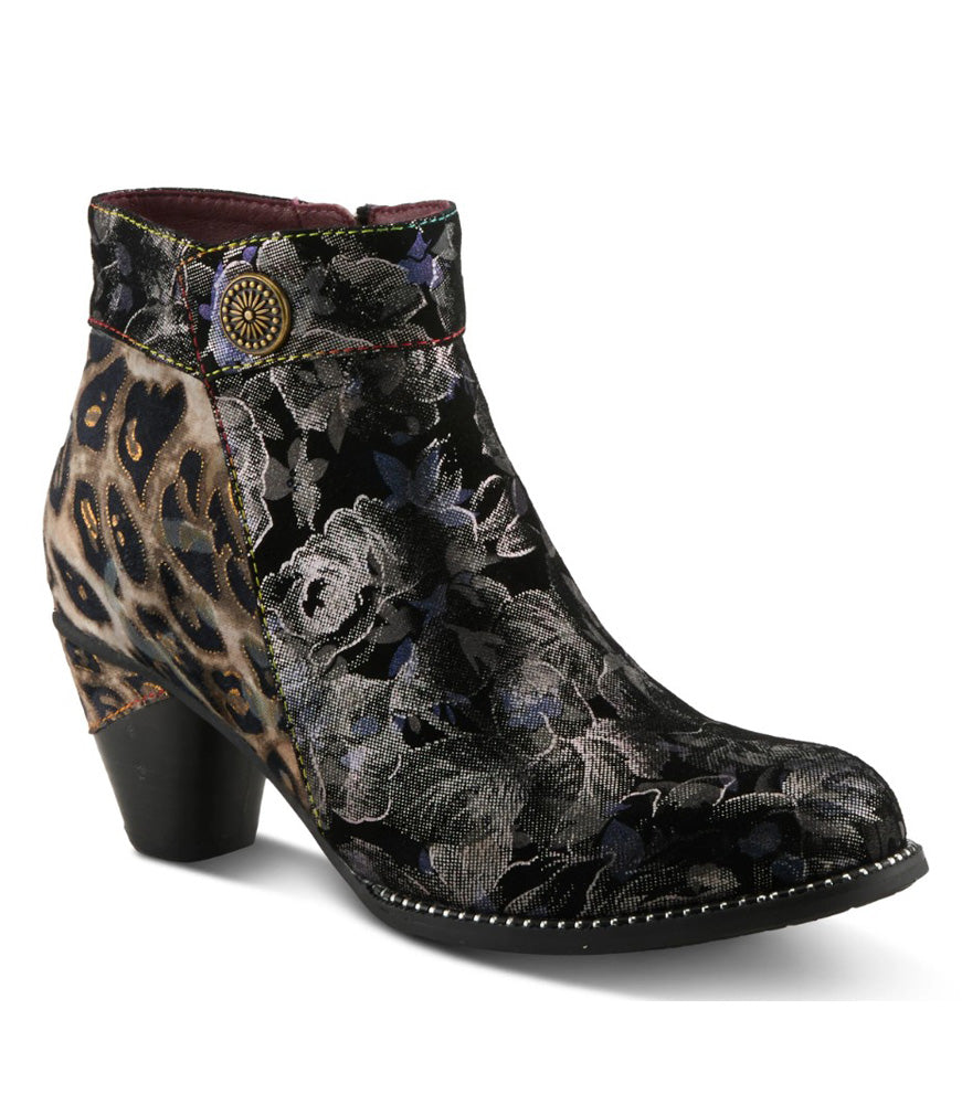 Turn heads with the bold beauty of our Dessalynn Pewter Floral Ankle Boot, a statement piece that blends sophistication with artistic flair. The boot features a luxurious velvet-like finish adorned with metallic floral designs in shades of pewter, silver, and blue, complemented by a leopard inspired heel panel for a daring contrast. A decorative antique gold button adds a vintage touch, while the stitched detailing enhances its handcrafted appeal.
