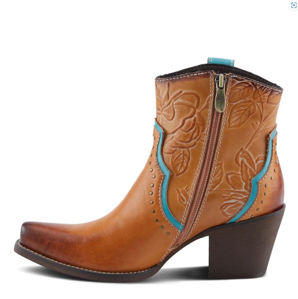 Channel southwestern flair with these tan leather ankle boots—featuring intricate floral embossing in rich rose hues, turquoise trim, antique brass studs, and a vintage button accent for a bold, feminine twist on western style.