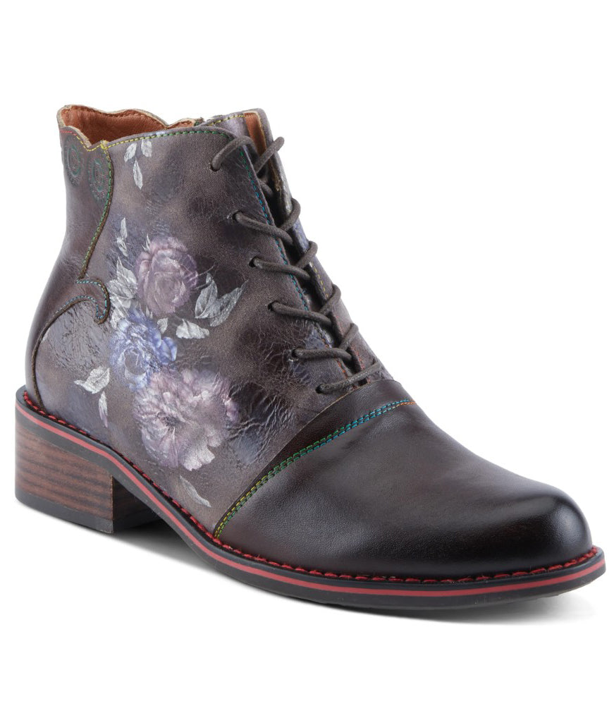 Elevate your everyday style with these vintage-inspired lace-up ankle boots—featuring rich chocolate brown leather, subtle floral embossing, multicolor stitching, and a stacked heel for a bold blend of edge and elegance.