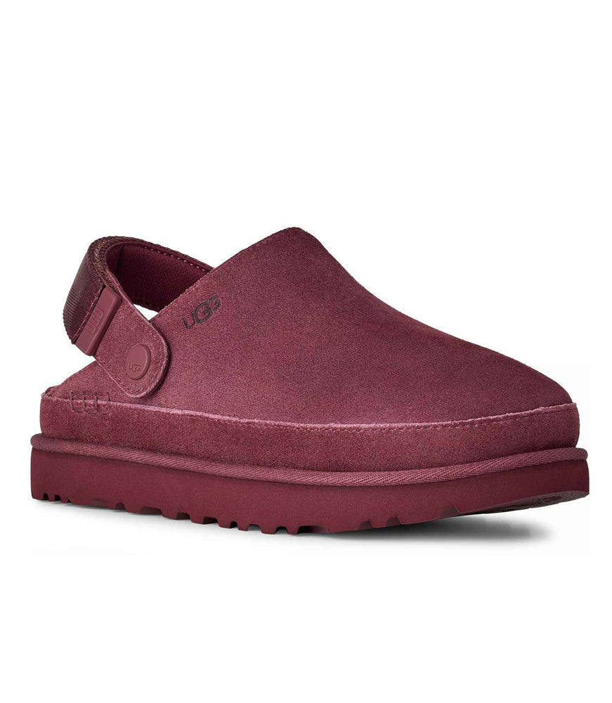Stylish and versatile slip-on clog in rich burgundy suede, featuring a cushioned sole and adjustable back strap for comfort and all-day wear.
