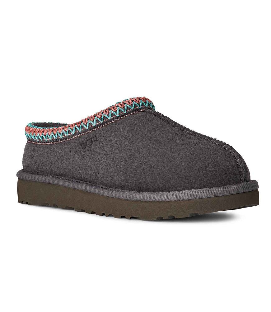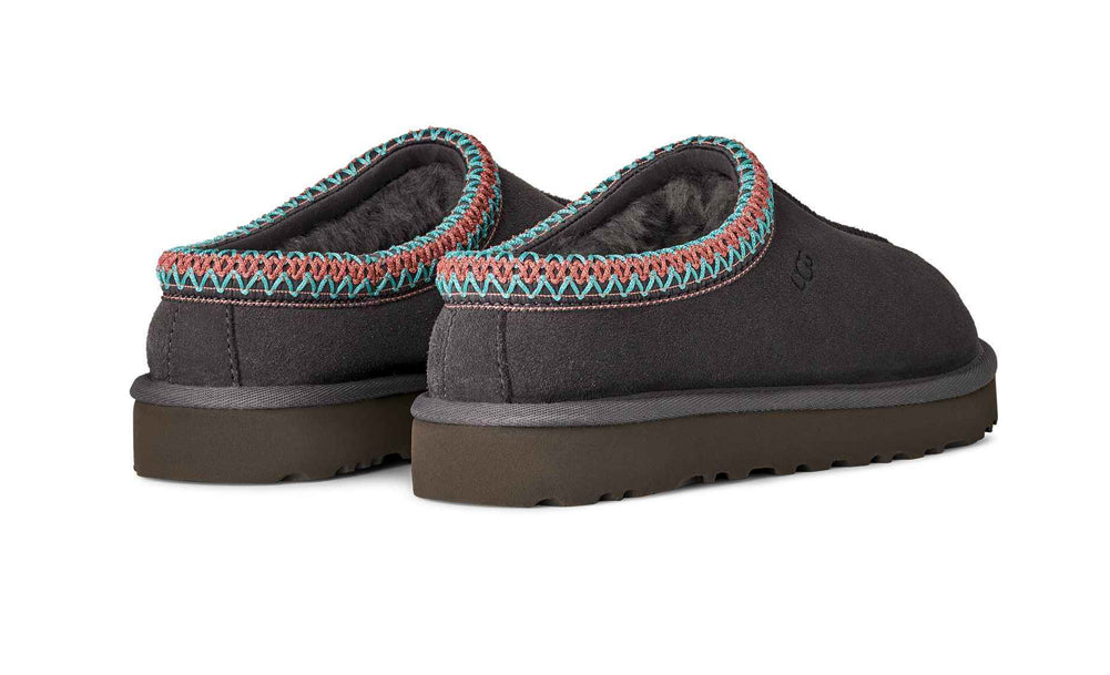 Stay cozy and stylish with the UGG Tasman slipper in dark grey, crafted from premium suede with a soft sheepskin lining and accented by the signature colorful Tasman braid for versatile indoor-outdoor comfort.