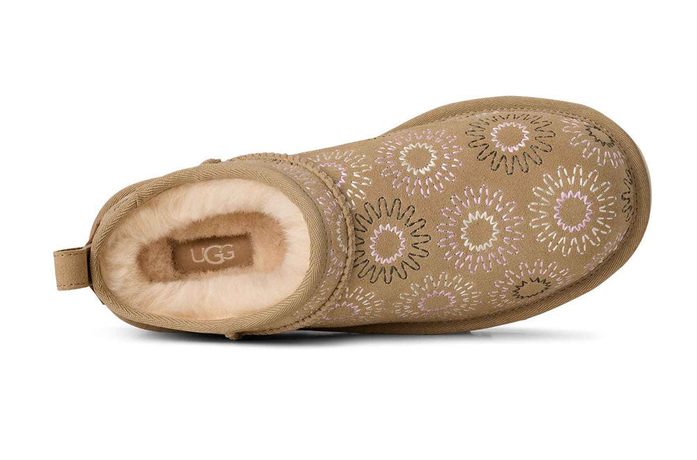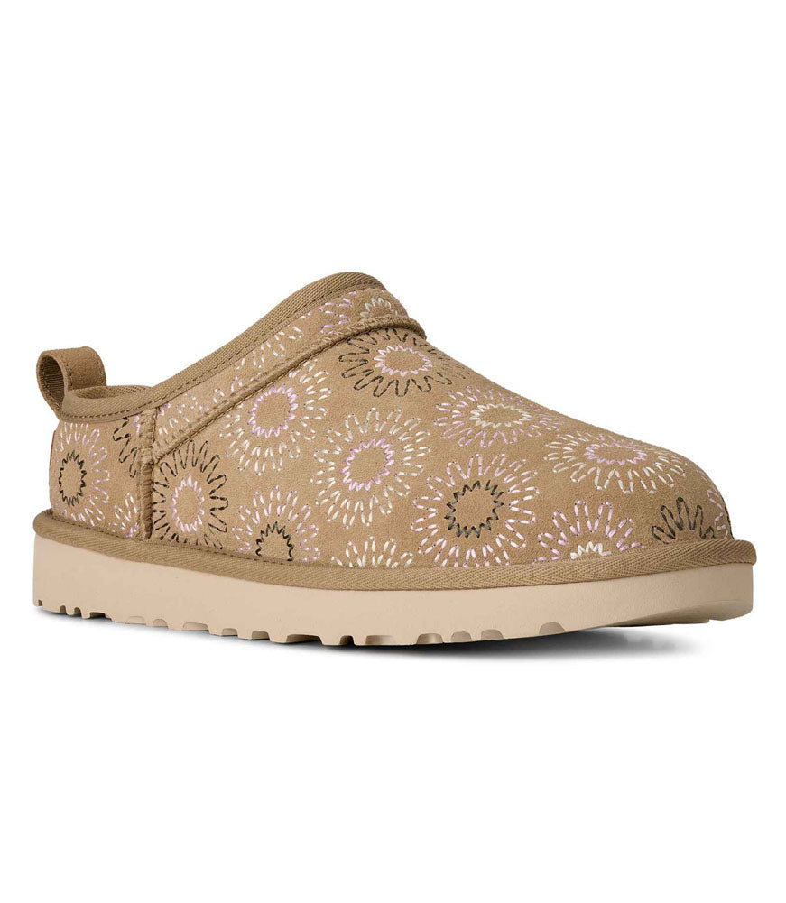 Playful yet cozy, this UGG slip-on clog features a soft suede upper with charming floral embroidery that adds a fun, feminine touch. Designed with a cushioned sole and easy pull-on fit, it offers all-day comfort while bringing a standout style to casual outfits, cozy days at home, or relaxed everyday wear.