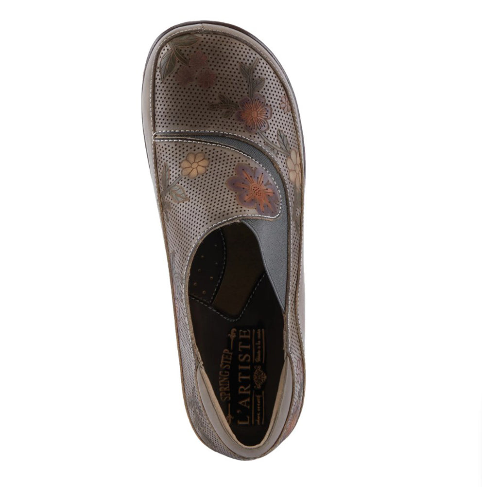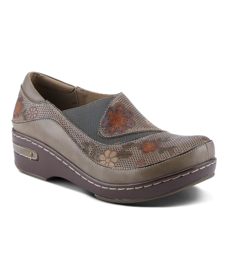 Comfort meets creativity in this slip-on wedge—crafted in soft grey with floral cutouts, contrast stitching, and elastic goring for easy wear, it's the perfect blend of everyday ease and artisanal flair.