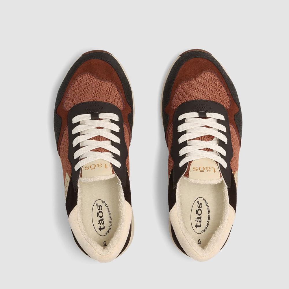Sleek and sporty, this rust and brown lace-up sneaker features breathable mesh panels, leather overlays, and a cushioned sole with arch support. Perfect for all-day comfort and modern casual style.