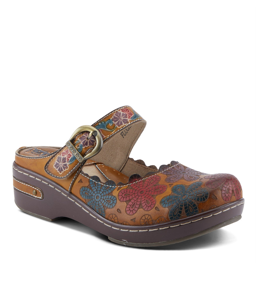 A playful twist on comfort, this tan clog features embossed floral patterns in earthy tones, a scalloped edge design, and an adjustable antique brass buckle strap, all atop a cushioned sole built for all-day wear.