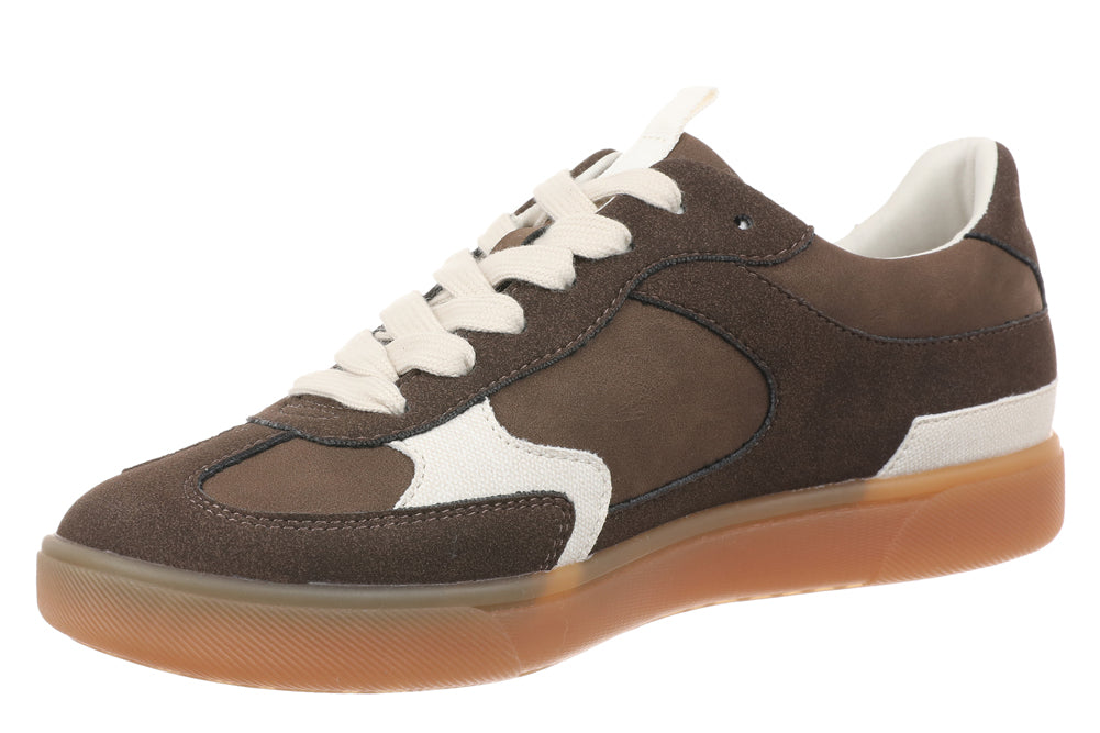 Keep it classic and cool with these brown low-top sneakers, featuring a mix of suede and canvas textures, crisp white accents, and a translucent gum sole—perfect for effortless everyday style with a touch of retro flair.