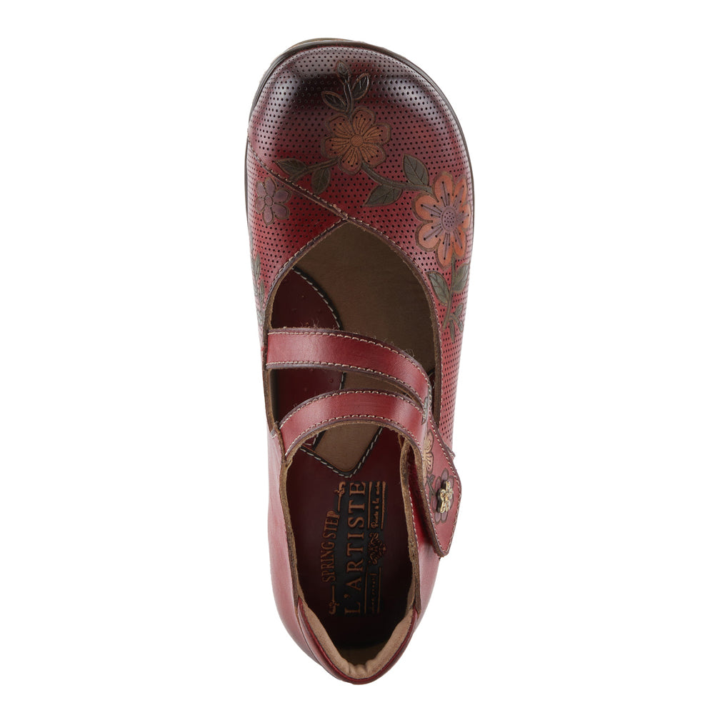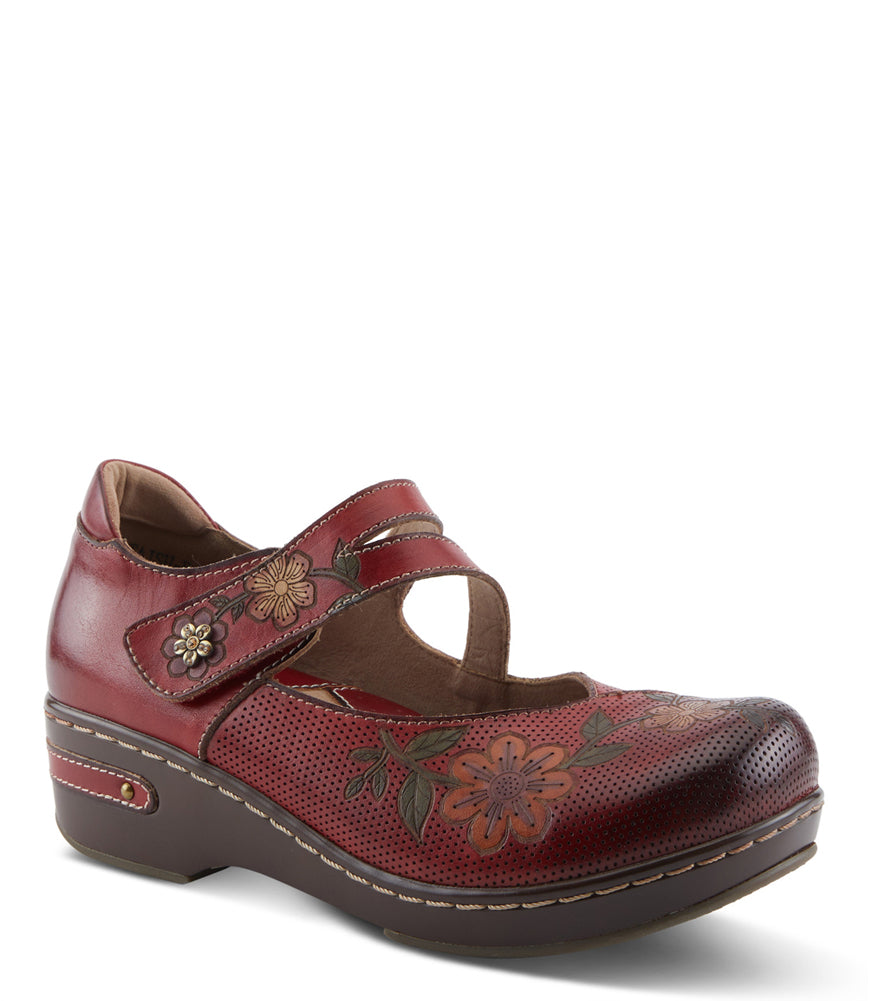 Crafted in deep red leather, this Mary Jane features embossed floral accents, perforated detailing, and dual adjustable straps on a supportive low wedge sole. Balancing everyday comfort with feminine charm.