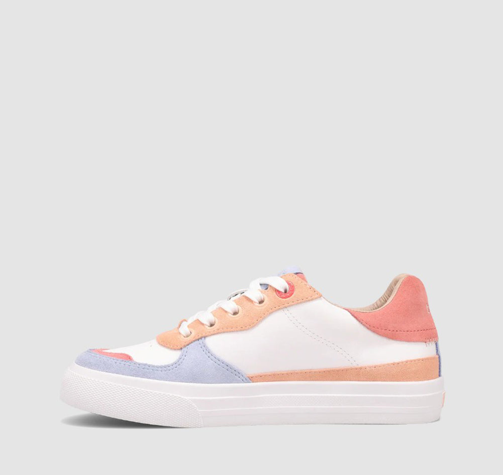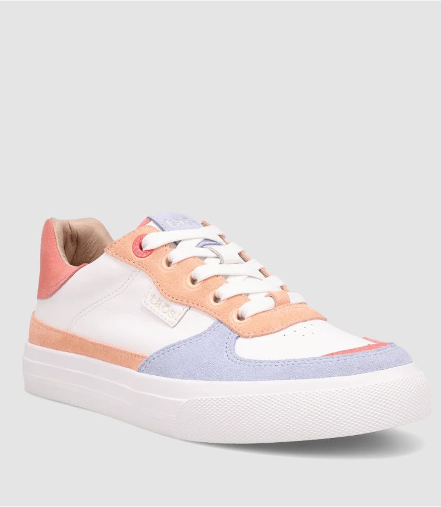 Brighten your step with this playful lace-up sneaker, crafted in white leather with pastel suede overlays in peach, lilac, and coral, finished with a cushioned platform sole for comfort and modern style.