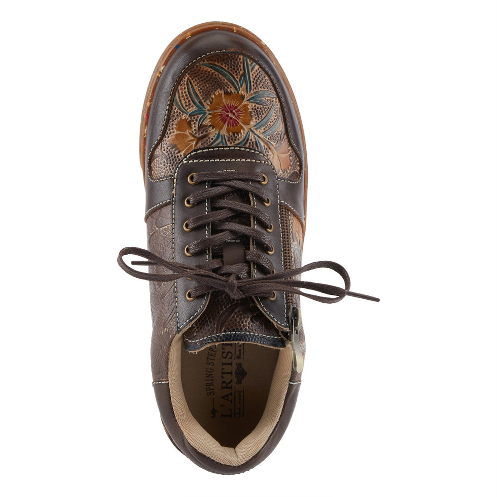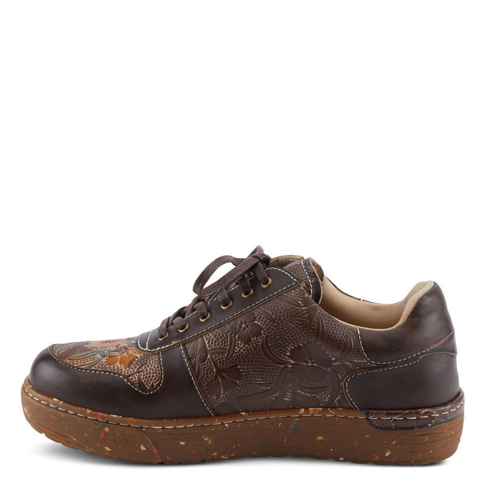 A perfect balance of casual comfort and artisan detail, this brown leather sneaker features embossed floral panels, a convenient side zipper, and a speckled platform sole that adds modern flair to everyday wear.