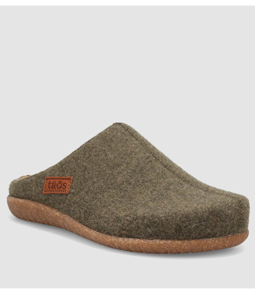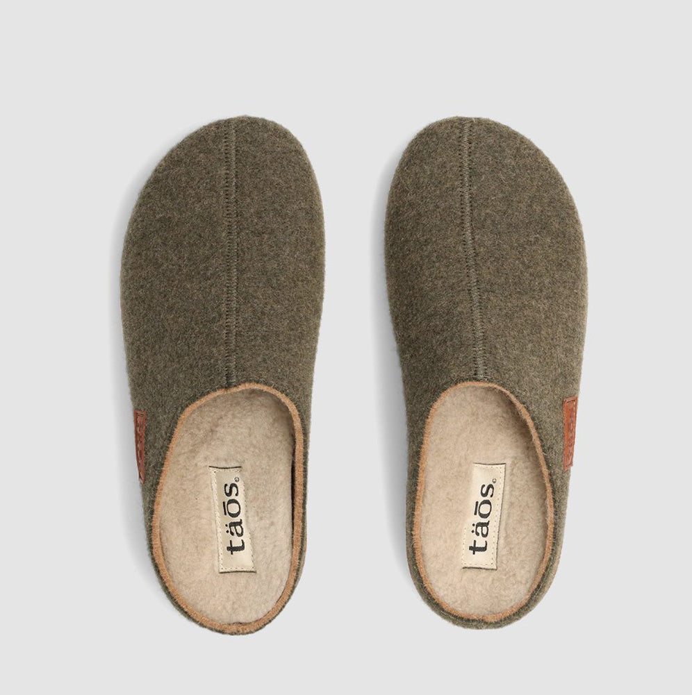Simple and cozy, this olive wool-blend mule slipper features a soft faux-shearling lining and a cork-infused cushioned sole. Perfect for effortless warmth, comfort, and durability indoors or out.