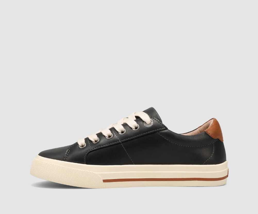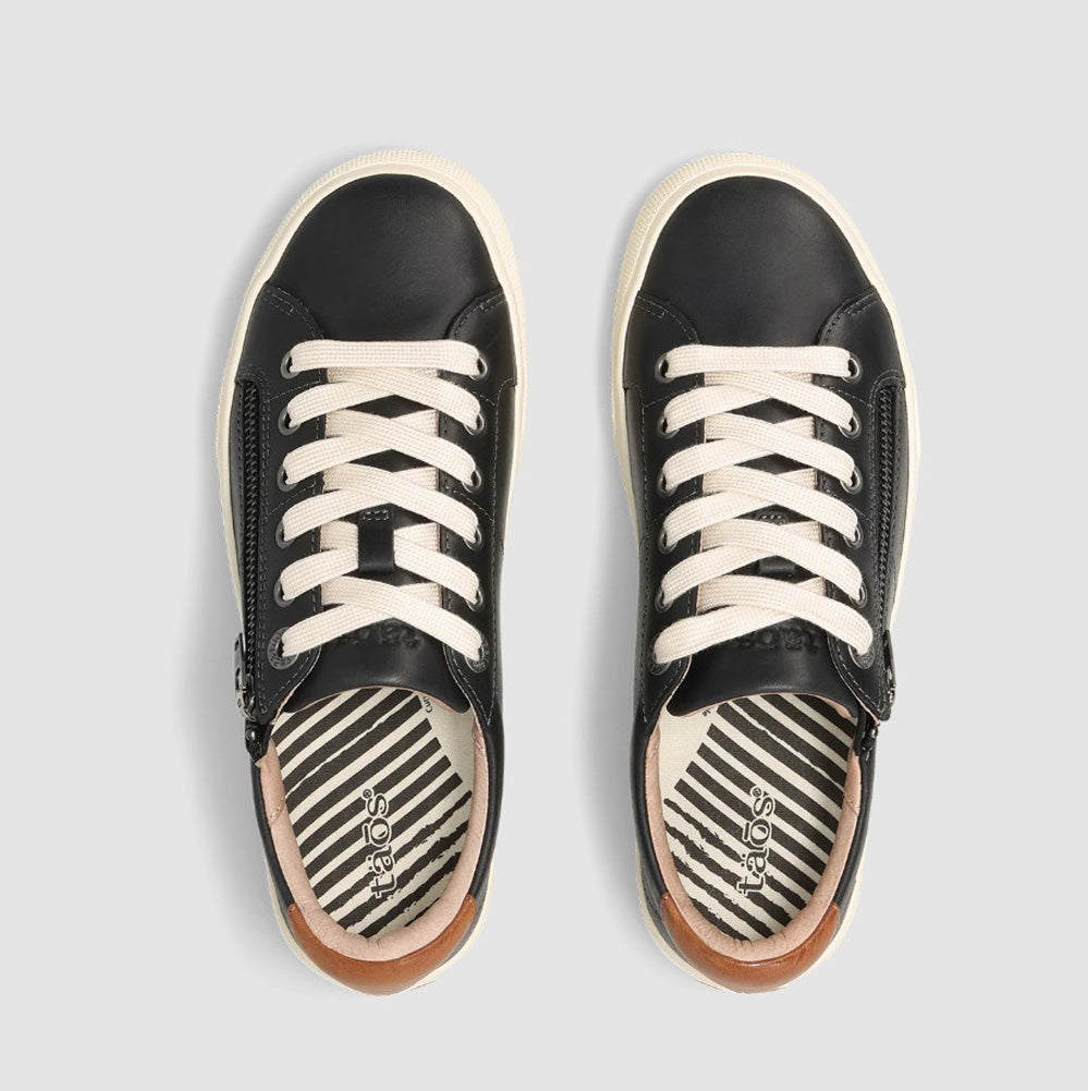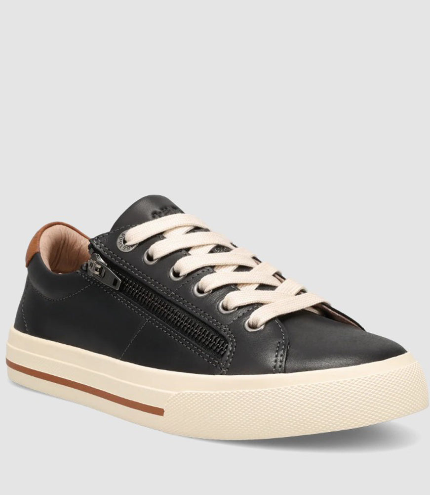 Sleek and modern, this black leather sneaker features cream laces, a side zipper for easy on-and-off, and a cushioned white rubber sole with contrast trim. Delivering everyday versatility with a stylish edge.